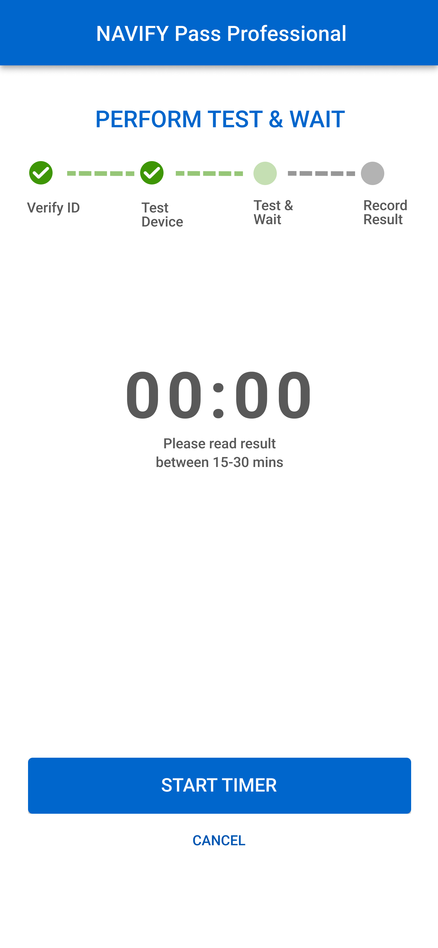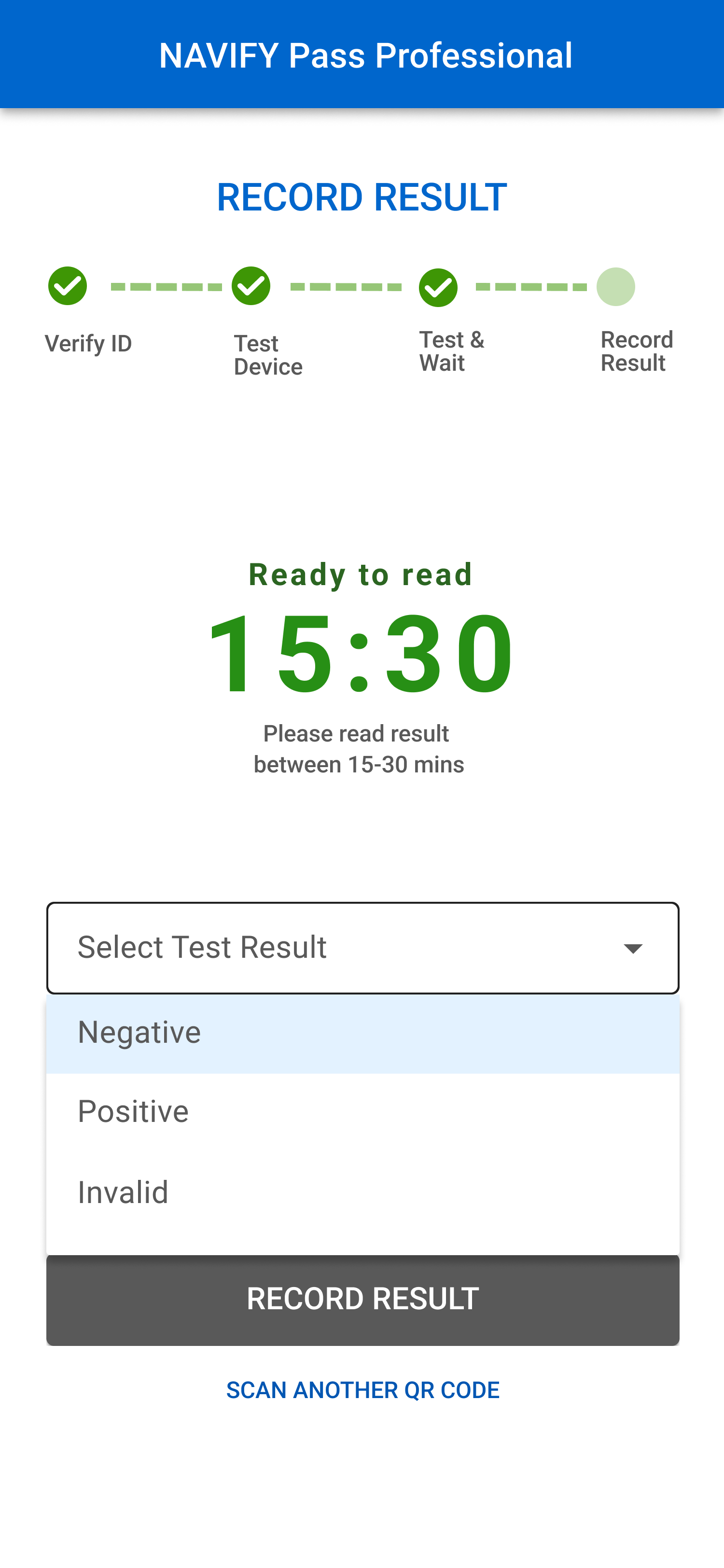 As a healthcare provider, I scan the patient’s QR code and select the test type. After scanning the test kit’s QR code, I perform the test and start the timer. I then proceed to the next patient. Once the test is ready, I scan the kit to log the result and can either log another result or begin a new test.